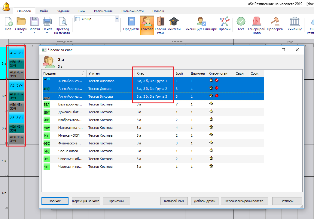 Как да обознача часовете, в които учениците от два класа са сборна група?