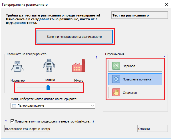 Кликнете бутон Tестване на разписанието. Или започнете генерирането.