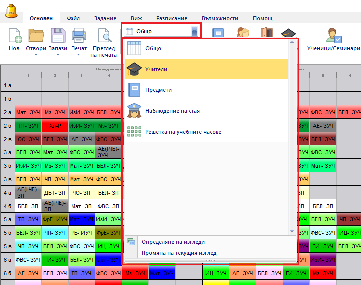 Можете да тествате много класове/ учители/ класни стаи/ учебни предмети/ ученици по този начин: FПърво, отворете съответния изглед (Цяло разписание/ Учители/ Класни стаи/ Предмети/ Ученици).