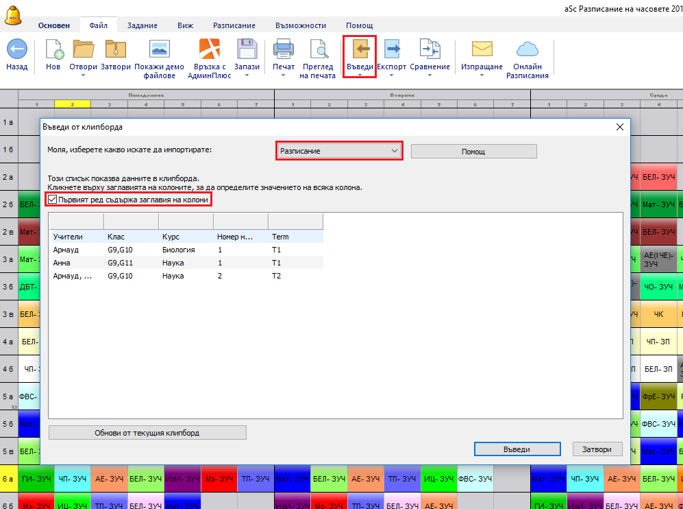 2. Отворете разписанието и създайте нов документ. След това отидете в меню Файл/ Въведи/ Внеси от клипборда.