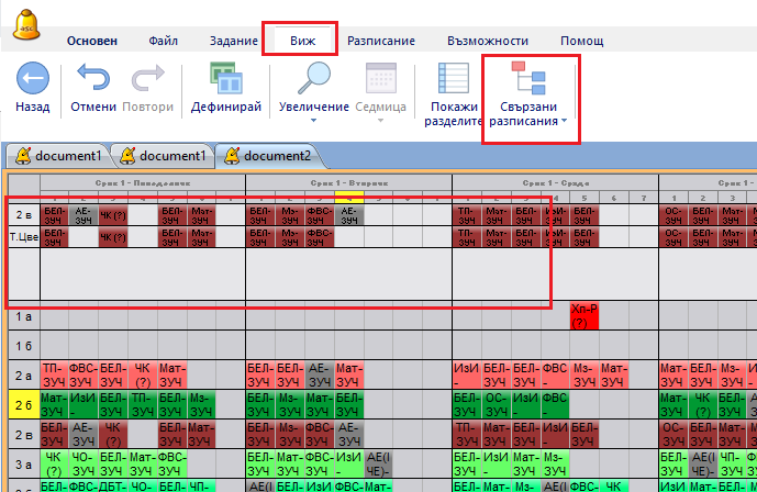 Може да активирате функцията "свързани разписания" в меню Виж/ Свързани разписания. Може да използвате бърз клавиш Ctrl+R.