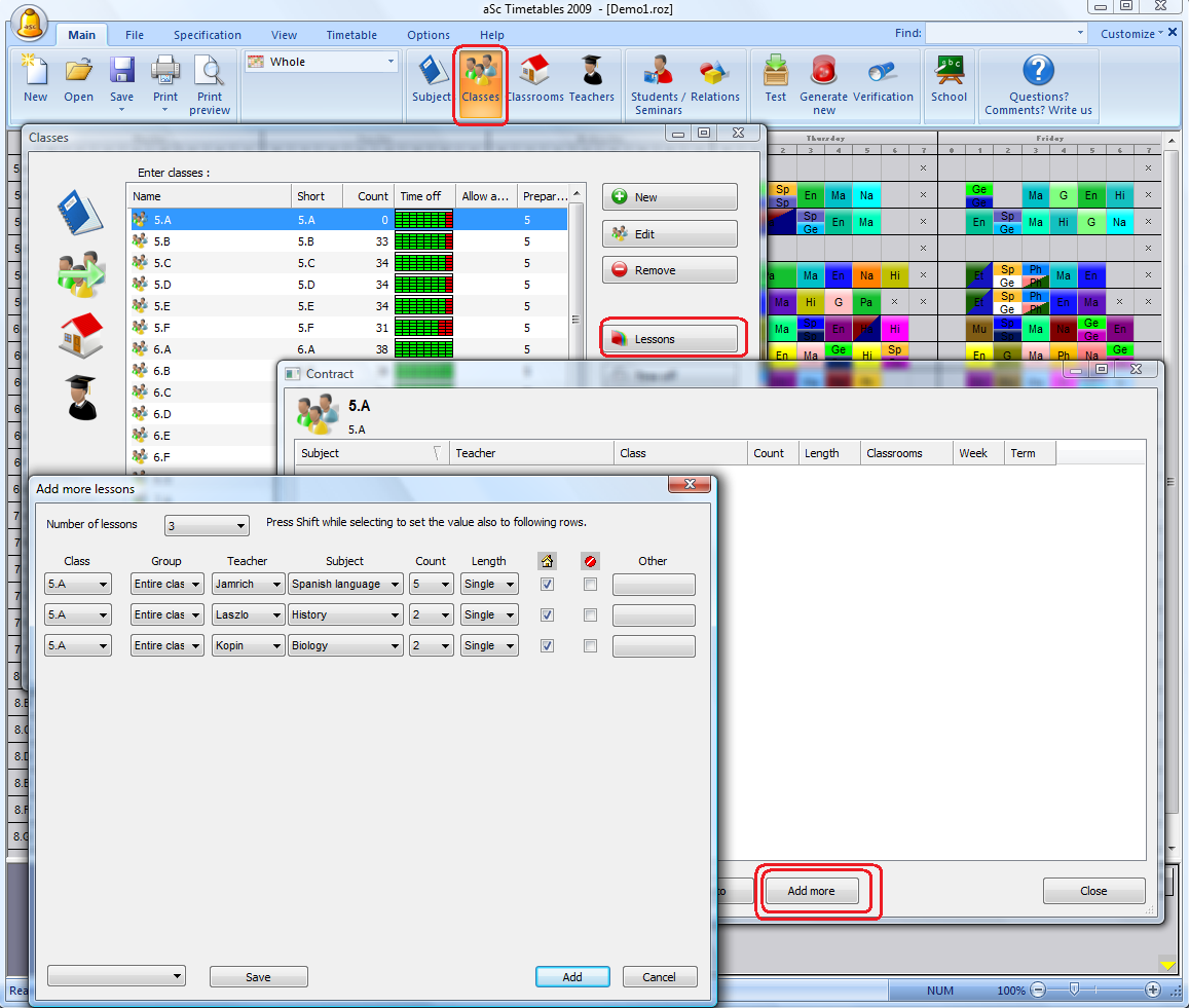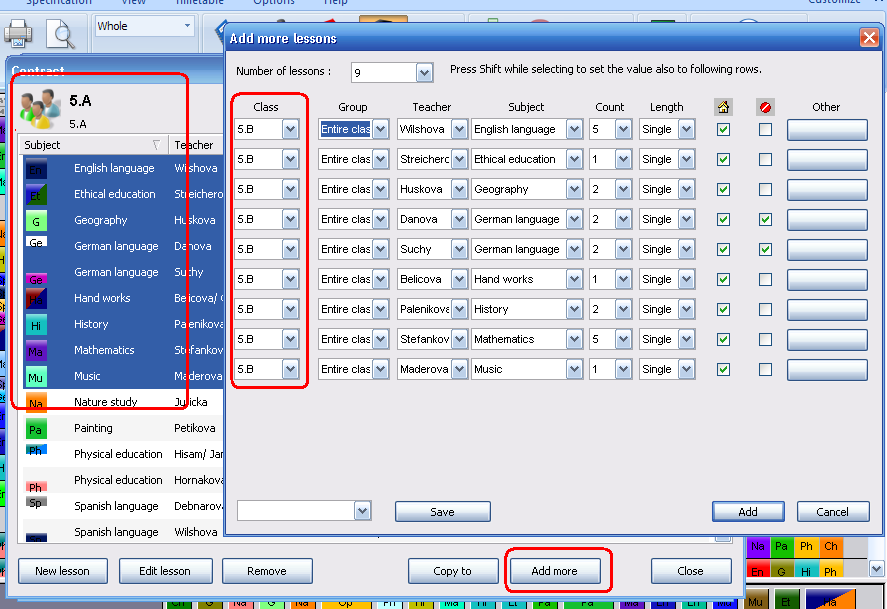 3. Also you can select several lessons in the Lessons dialog, then press 'Add more'. The selected lessons are automatically filled into the dialog. Then use SHIFT to change columns if needed and add the modified lessons to the timetable: