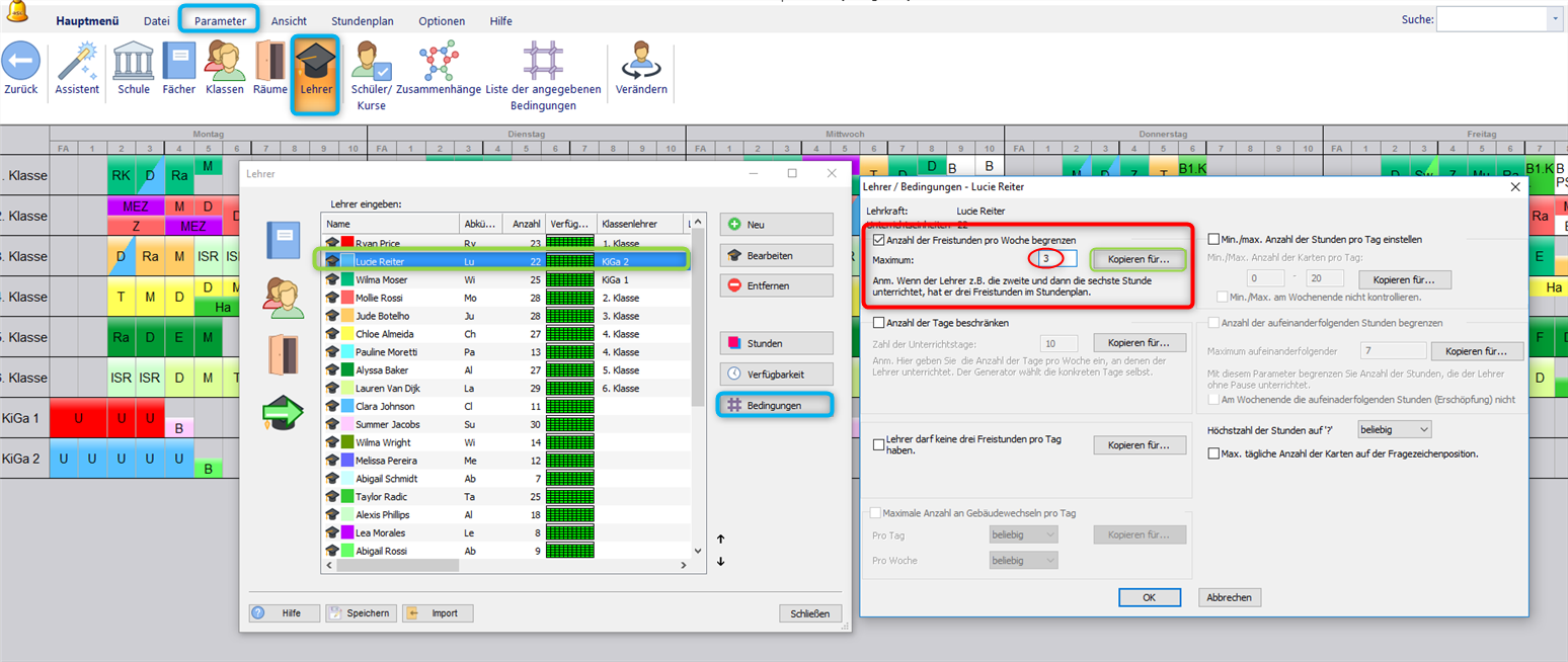 Dann geben Sie unter Parameter- Lehrer - Auswahl Person - Bedingungen, die individuelle Anzahl an maximalen Freistunden pro Woche ein.