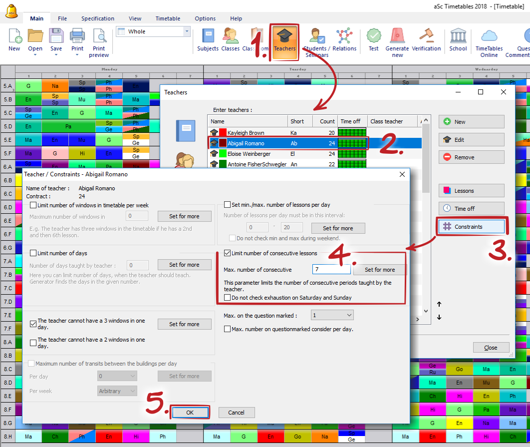 Sie können auch die max. Anzahl von nacheinander folgenden Stunden für jeden Lehrer individuell eingeben: