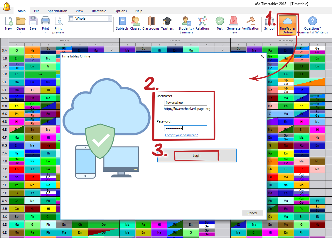 Then login to your edupage. Use name of your edupage as "Username" and input admin's password, or you can use password to teacher's account, who has the rights to publishing the timetable.