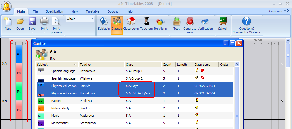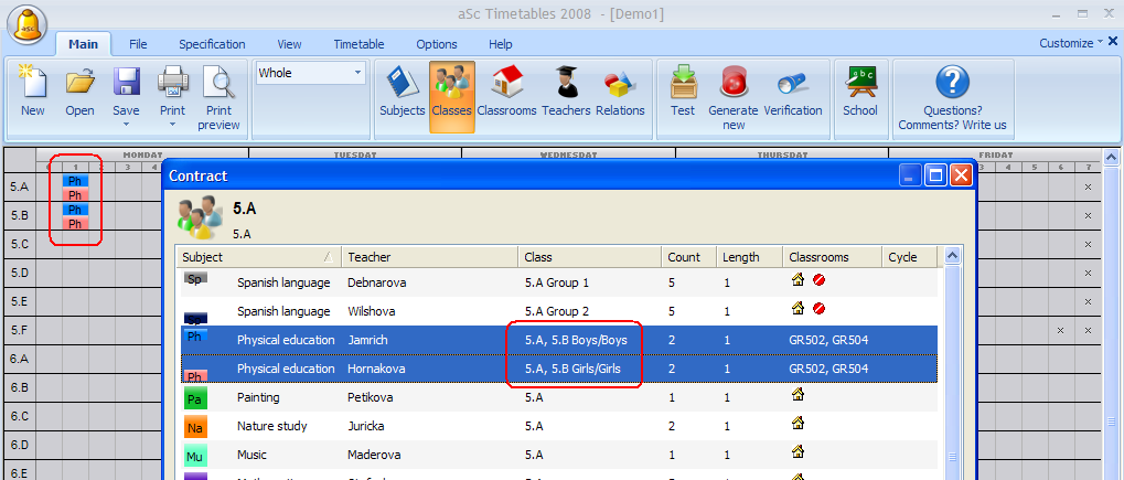 Si la escuela tiene muchos chicos, tienen que crear dos grupos de chicos. Así que tenemos 3 profesores, uno para chicos en 5A, uno para chicos en 5B y un profesor que toma chicas de 5A y 5B: