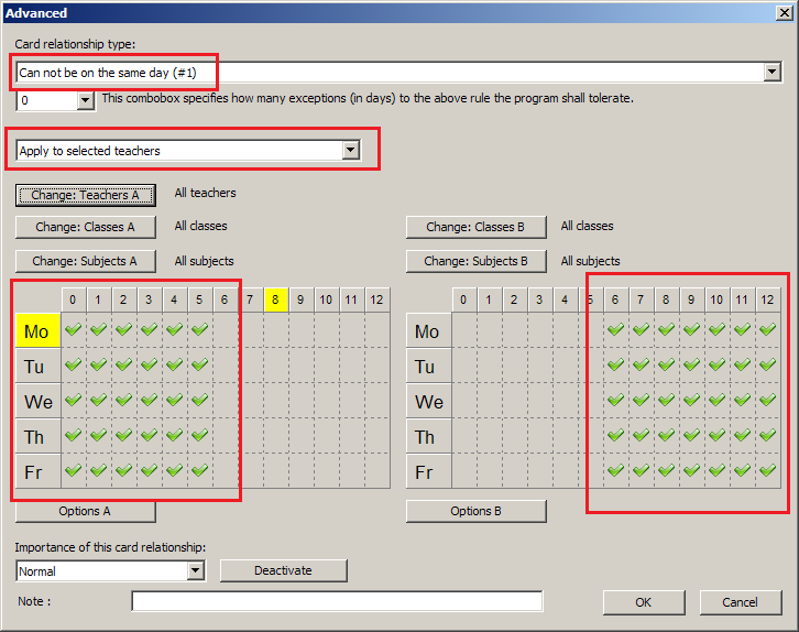 You do not need to mark all the periods, if you for example leave the 6th period unchecked on both sides it will simply mean the software will ignore the lessons placed on 6th period when checking this rule. Then teacher can have 1-5 + 6 but not 1-5 + 7