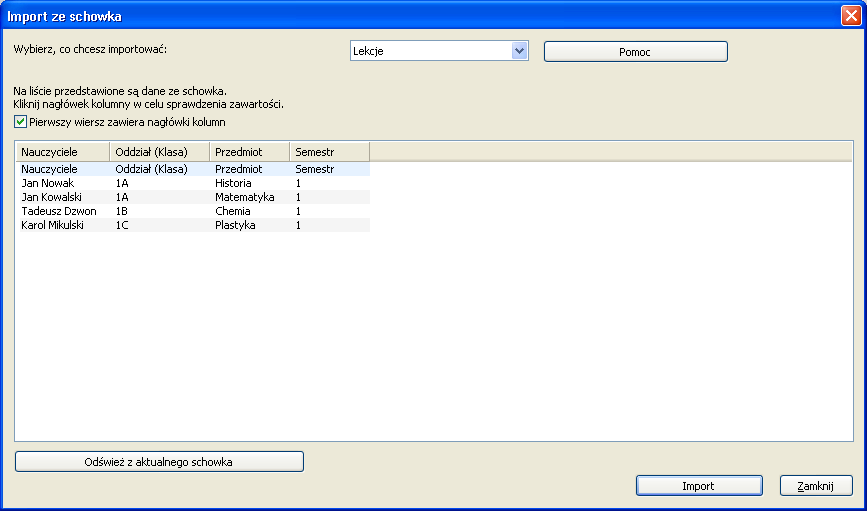 3. Z listy rozwijanej wybierz Lekcje, a poniżej zaznacz opcję "Pierwszy wiesz zawiera nagłówki kolumn". Jeśli nagłówki kolumn w pliku Excela są dokładnie takie same jak nazwy kolumn w programie (np. "Nauczyciele" czy "Oddział (Klasa)"), to nagłówki wklejanych danych powinny zostać uzupełnione automatycznie.