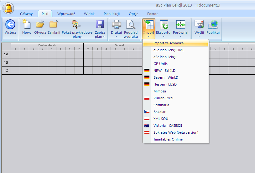 2. Otwórz program aSc Plan Lekcji i stwórz nowy dokument. Następnie przejdź do zakładki Pliki i wybierz Import/Import ze schowka.
