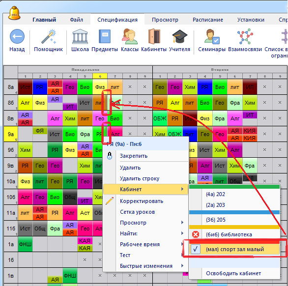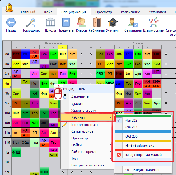 4. При ручной корректировке расписания, программа при выборе кабинета показывает его тип: