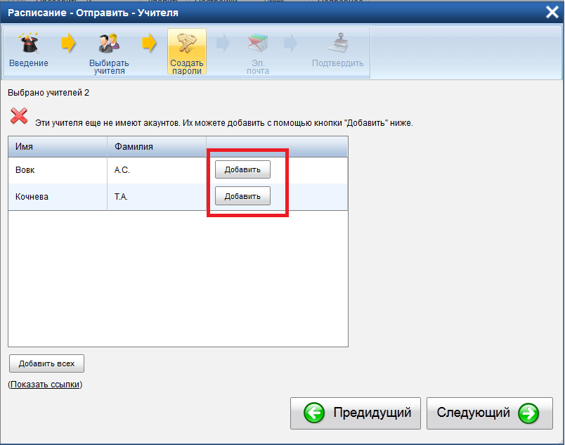 Программа может попросить Вас создать пароли для новых учителей. Это происходит, когда Вы отправляете расписание по емейлу новым учителям, которые были добавлены в расписание, но их еще нету в базе данных Интернета. Вы можете добавить их просто нажав кнопку "Добавить" рядом с их именем.