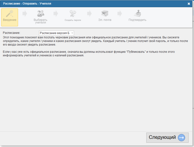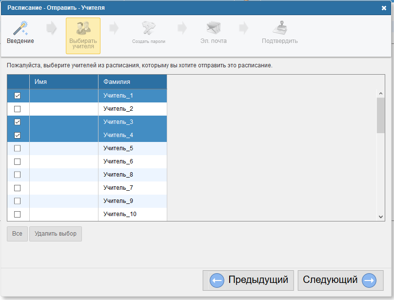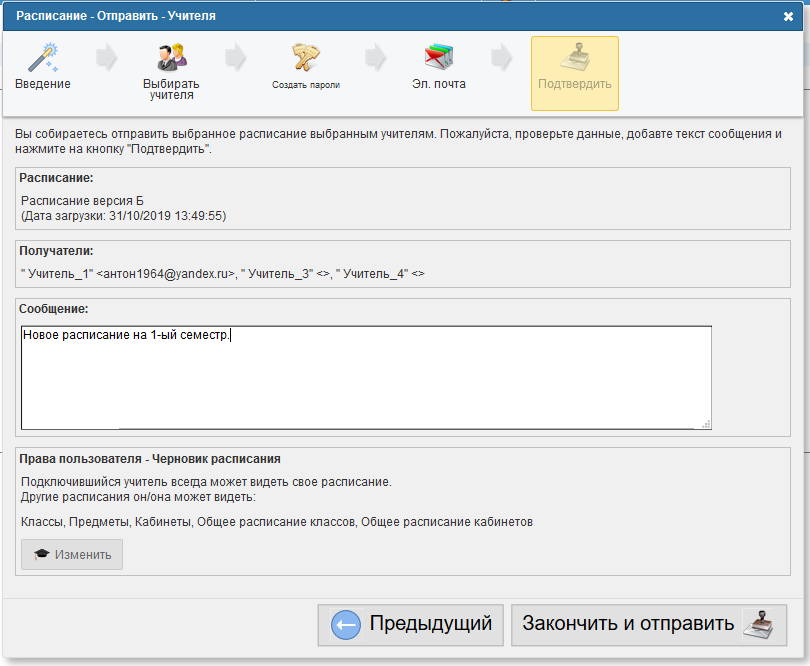 Появится диалоговое окно, где Вы можете выбрать, для которых учителей хотите отправить это расписание. Вы можете отправить его нескольким учителям для пересмотра или для всех учителей.