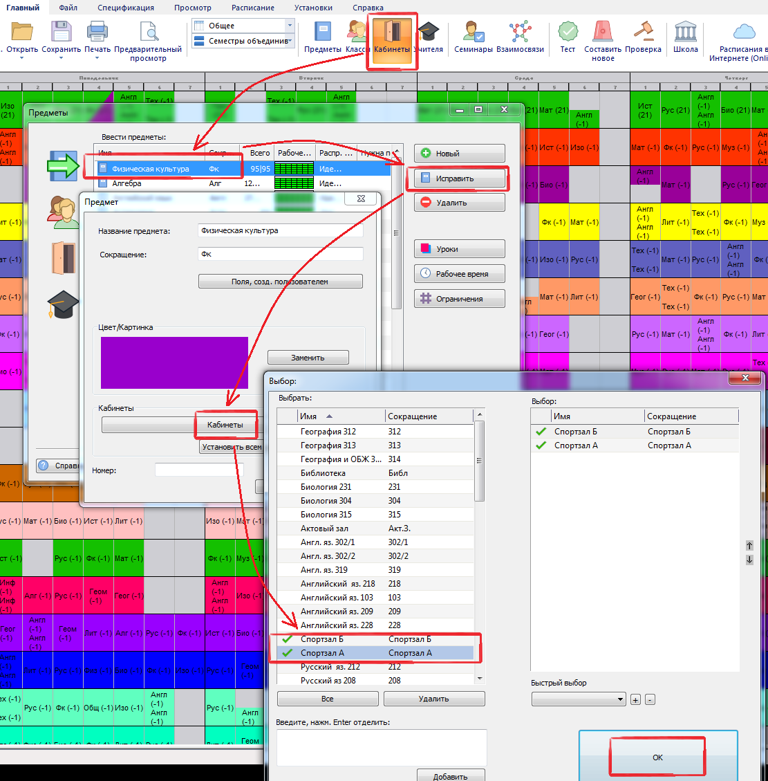 Для каждого предмета можно указать, что уроки по этому предмету должны быть в определенных кабинетах: