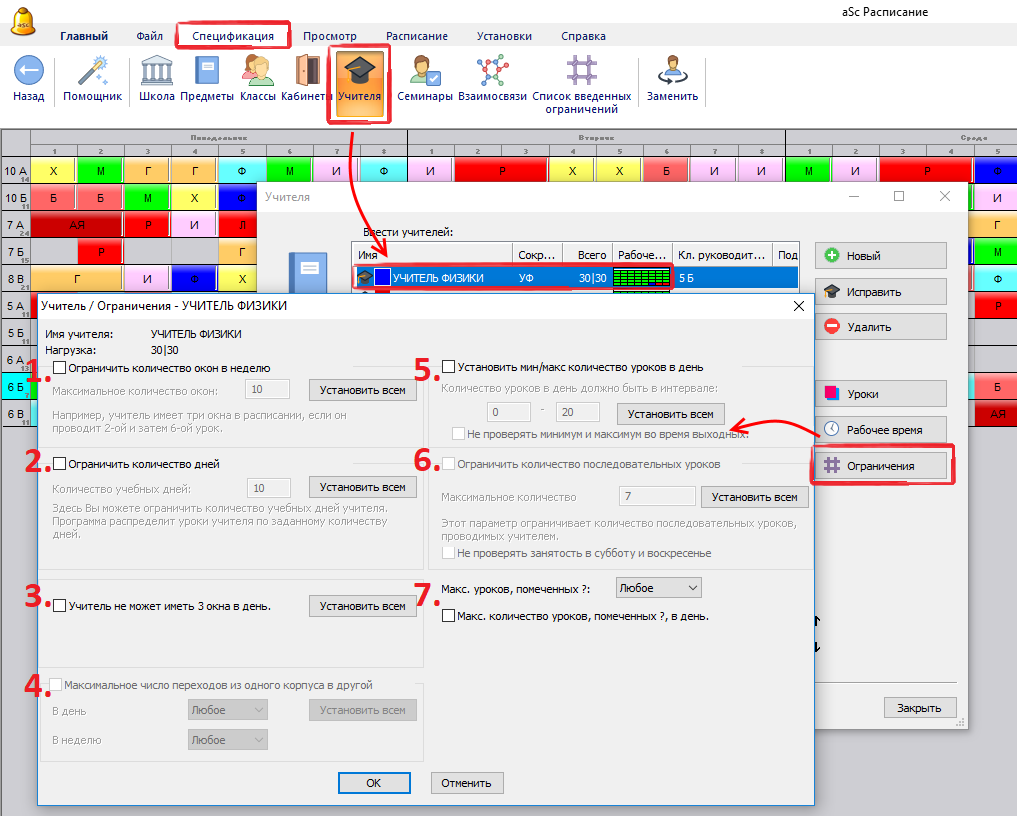 6.Ограничить число последовательных уроков.Оно определяет максимальное число уроков, которые учитель может обучать без перерыва (окна в его расписании). Смотрите: Наши учителя не могут преподавать больше чем 6 уроков последовательно