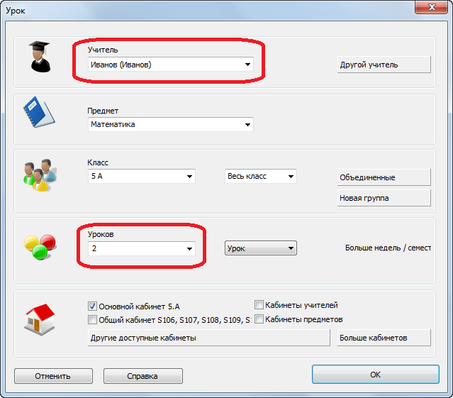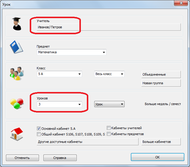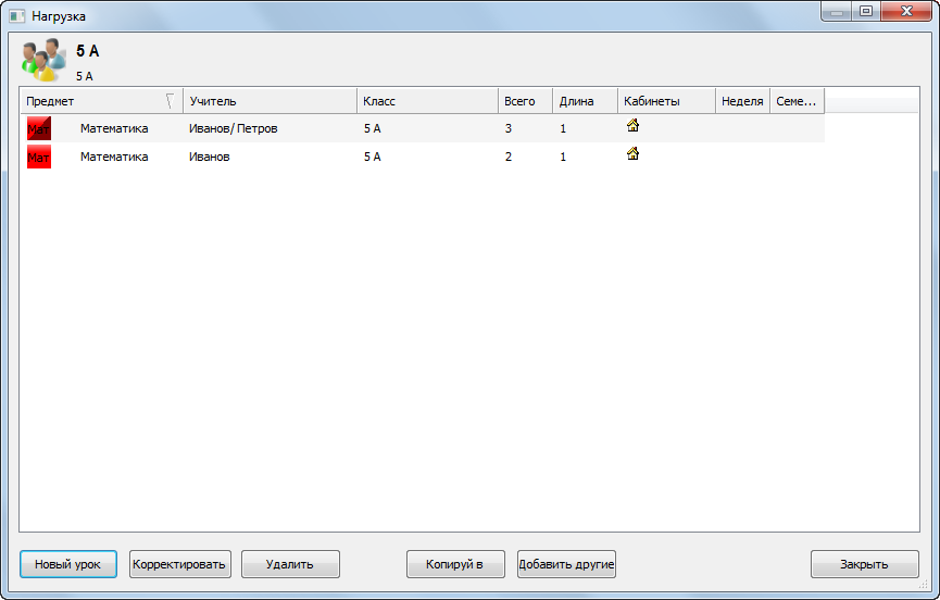 - если Вы используете тот же предмет для обеих нагрузок, то программа автоматически пытается расставить эти 5 уроков в равной степени за неделю, в случае 5-дневной учебной недели - по одному уроку в день.