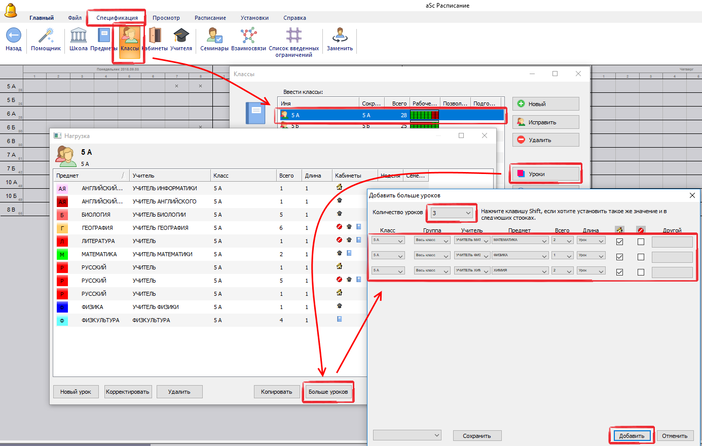 3. Также вы можете выбрать несколько уроков (с Ctrl или Shift) в окне Нагрузок и нажать кнопку "Больше уроков". Выбранные уроки будут автоматически загружены в окно. Затем используйте SHIFT для одновременного изменения данных в колонках и добавьте измененные уроки в расписание: