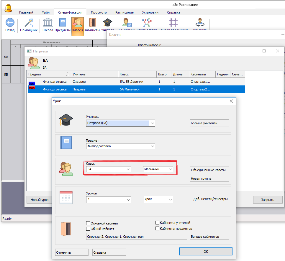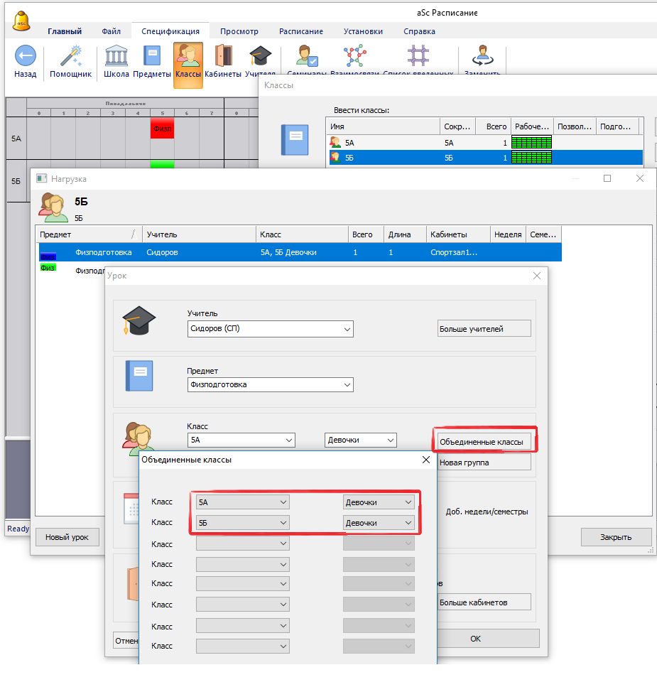 Есть урок физкультуры, объединенный для девочек из двух классов, но мальчики из этих классов имеют отдельный урок для каждого класса.