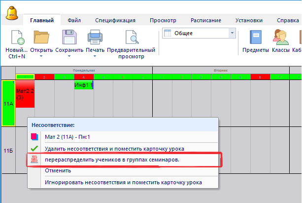 Если Вы выберите эту функцию, программа позволит Вам поместить карточку урока в это положение и сразу перераспределит учеников в группах семинара так, чтобы избежать коллизий (чтобы ни один ученик не имел бы и других уроков в то время). Программа перераспределит учеников только между группами семинара. Программа никогда не определит ученику другого предмета и также не освободит его от урока семинара. Программа также учтет закрепленные выборы групп семинара для учеников в окне Семинаров.