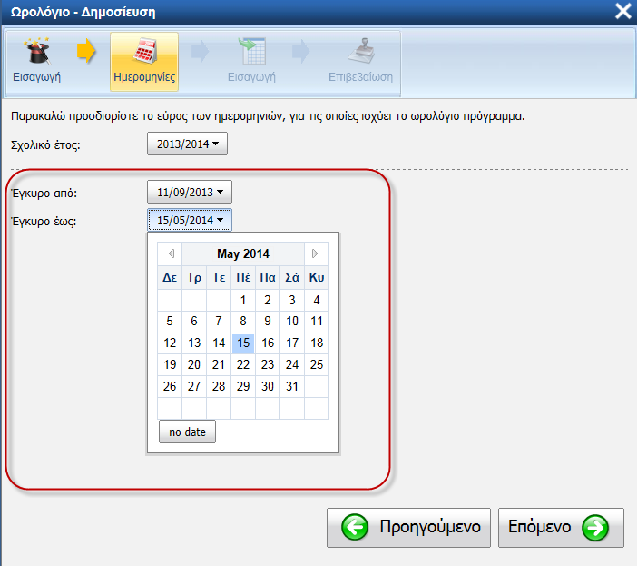 Για κάθε ωρολόγιο πρόγραμμα μπορείτε να καθορίσετε το χρονικό διάστημα για το οποίο ισχύει, ορίζοντας τις ημερομηνίες από τα αντίστοιχα πεδία: