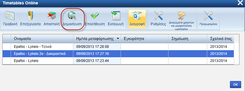 Ή μπορείτε να δημοσιεύσετε οποιαδήποτε από τα ωρολόγια προγράμματα που έχετε αποθηκεύσει οnline κάνοντας κλικ στο κουμπί "Δημοσίευση" μέσα από το menu "Διαχείριση":