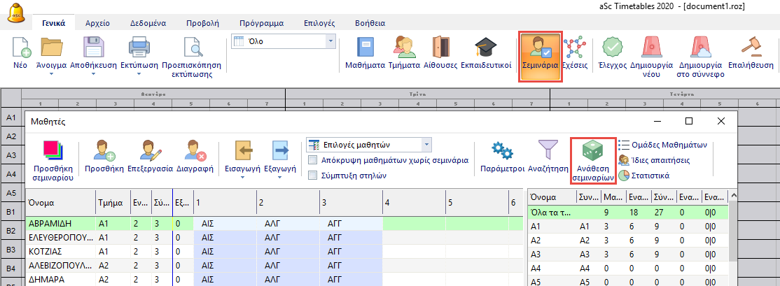 Η PRO έκδοση του aSc Timetables μπορεί να καταχωρήσει τους μαθητές σε ομάδες σεμιναρίων κατά τη διάρκεια της δημιουργίας του ωρολογίου προγράμματος. Μπορεί ακόμη να αλλάξει και την ομάδα σεμιναρίου του μαθητή, αν είναι διαθέσιμες περισσότερες ομάδες (εκτός και αν έχετε «κλειδώσει» τους μαθητές σε συγκεκριμένη ομάδα)