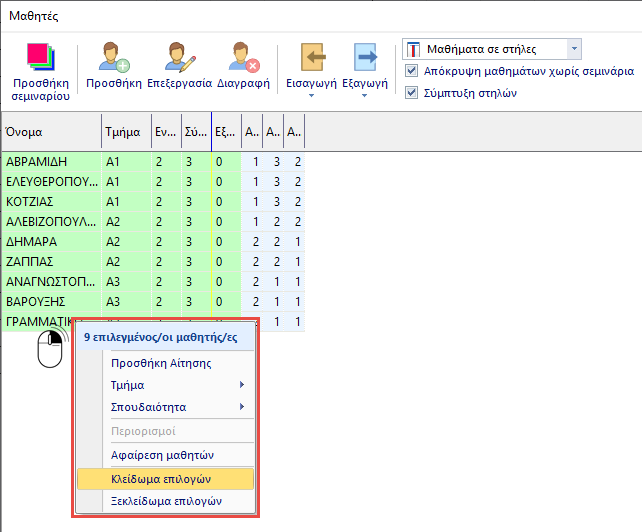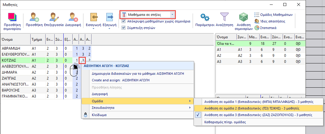 Επιλέξτε έναν ή περισσότερους μαθητές, στη συνέχεια, κάντε δεξί κλικ στη στήλη με το μάθημα που θέλετε να δηλώσετε στους μαθητές και στη συνέχεια επιλέξτε την ομάδα: