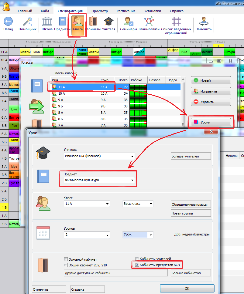 Для каждого предмета можно указать, что уроки по этому предмету должны быть в определенных кабинетах: