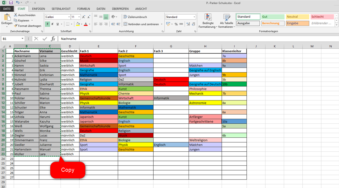 1. Kopieren Sie sich die Daten aus Ihrer vorbereiteten Excel-Liste. Markieren Sie darin die Felder, die Sie in aSc Stundenplan übertragen möchten.