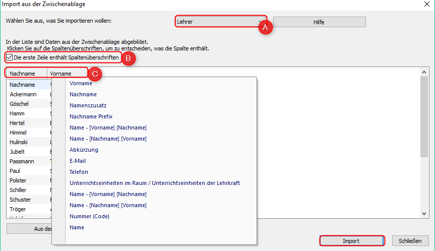Sie können außerdem auch Fächer-, Klassen- oder Raumdaten in aSc Stundenplan importieren.