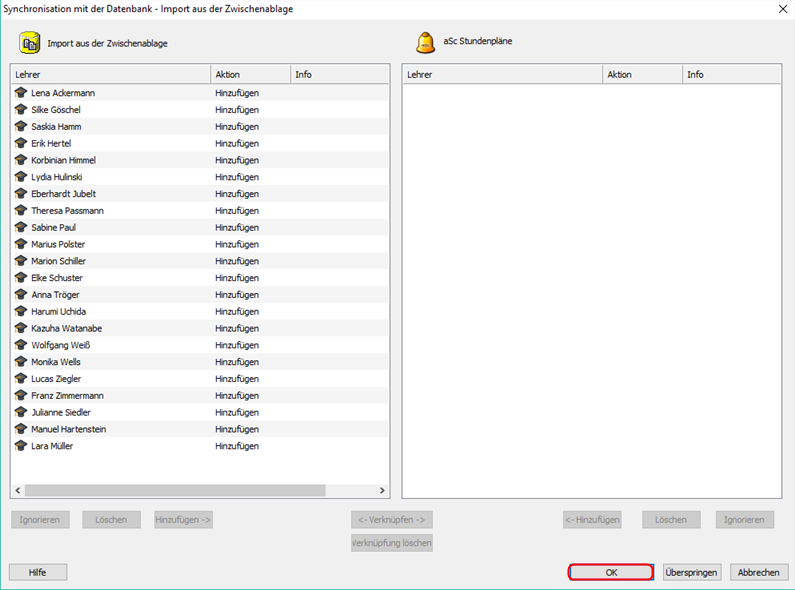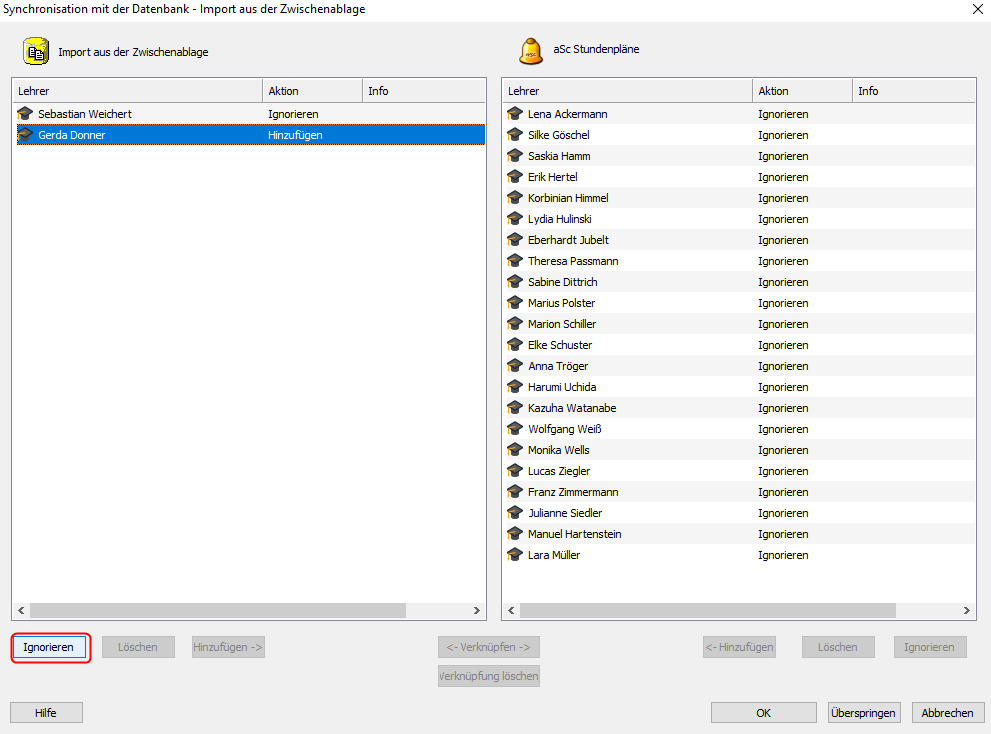 Sollten Sie schon einmal Daten in den Stundenplan eingefügt haben und Sie möchten die Daten aktualisieren, können Sie die neuen Daten mit den bereits vorhandenen Daten verknüpfen oder das Hinzufügen ignorieren.