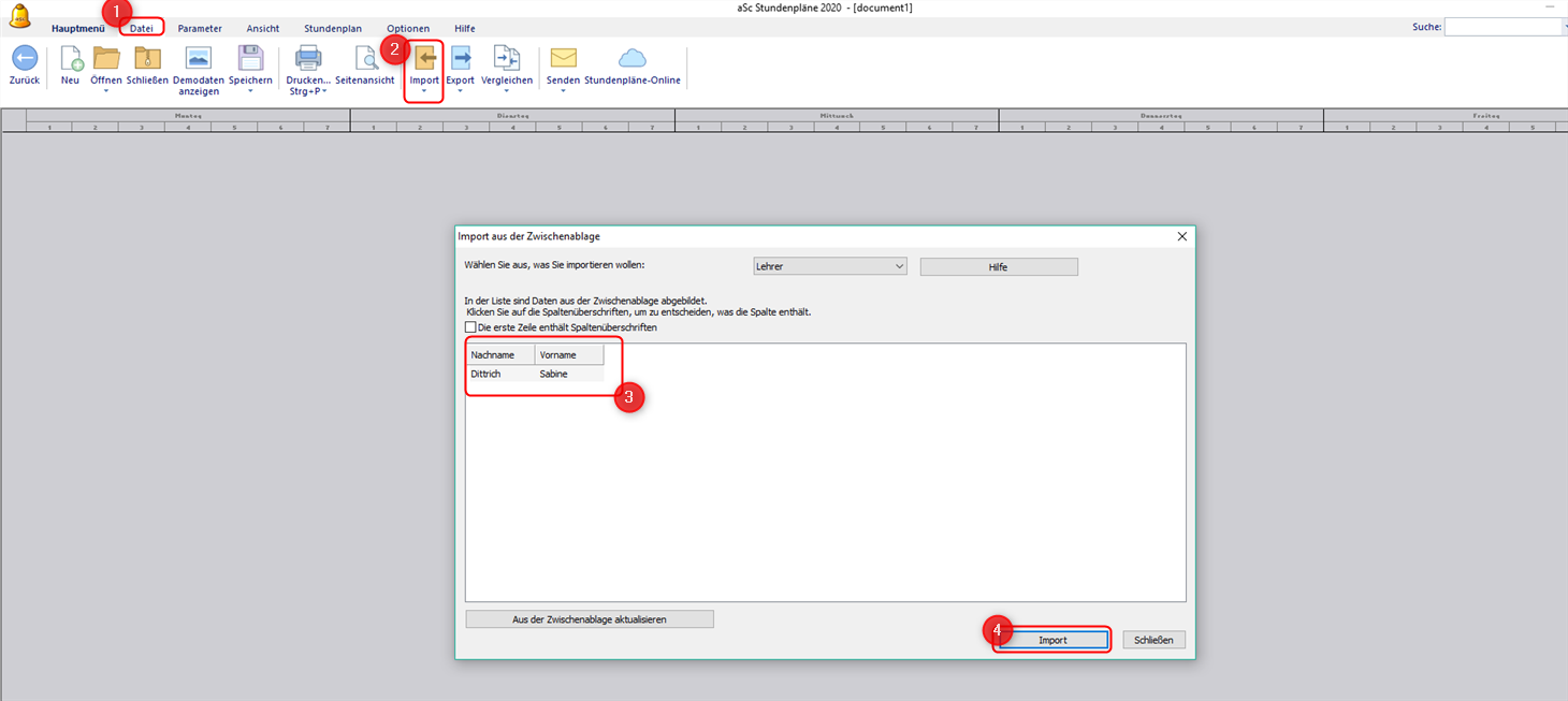 2. Um die Daten in aSc Stundenplan einzufügen, gehen Sie auf Datei, Import und Import aus der Zwischenablage.