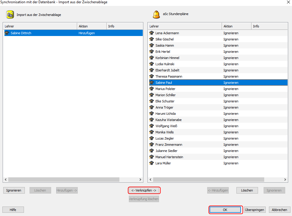 In dem neuen Fenster klicken Sie die linke Zeile an und danach die Zeile mit der Sie ersetzt werden soll. Wenn beide markiert sind, klicken Sie unten auf den Button Verknüpfen. Bestätigen Sie anschließend die Eingabe mit OK.