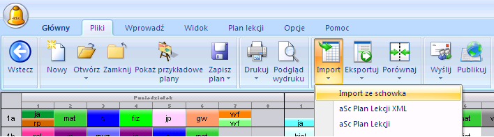 3. W programie Plan lekcji kliknij w menu Plik->Import->Import ze schowka.