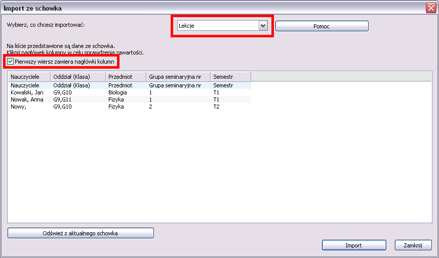 5. Z górnej listy wyboru wybierz „Lekcje”, ponieważ najpierw chcemy zaimportować do programu lekcje.
