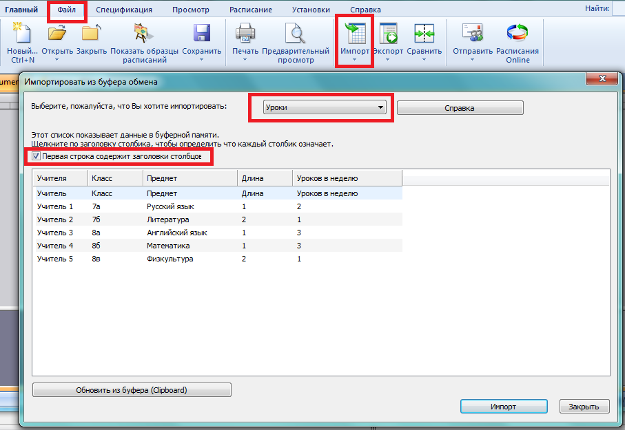 3. Затем откройте программу для составления расписаний и выберите в меню "Файл" "Импортировать / Импортировать из буфера обмена"