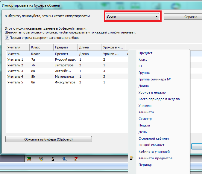 Импортируя уроки можно заполнить следующие колонки: Учитель, Предмет, Класс, Группы, Длина, Уроков в неделю, Кабинет и др.