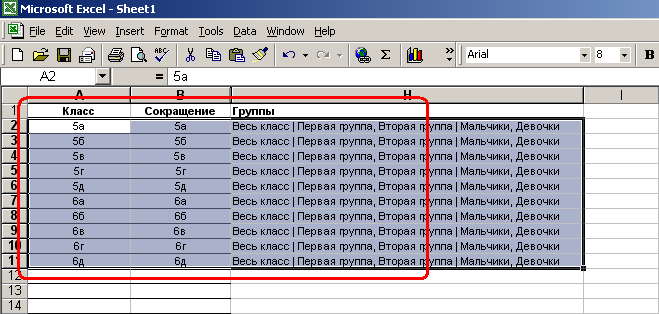2. В MS Excel выберите первую таблицу с классами и скопируйте их в буфер временной памяти (Clipboard)– для этого нажмите на клавиши CTRL+C.