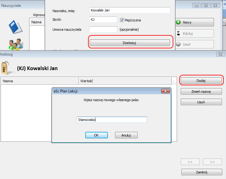 Po kliknięciu przycisku Dostosuj można wpisać i stworzyć nowe pole danych o nazwie Stanowisko.