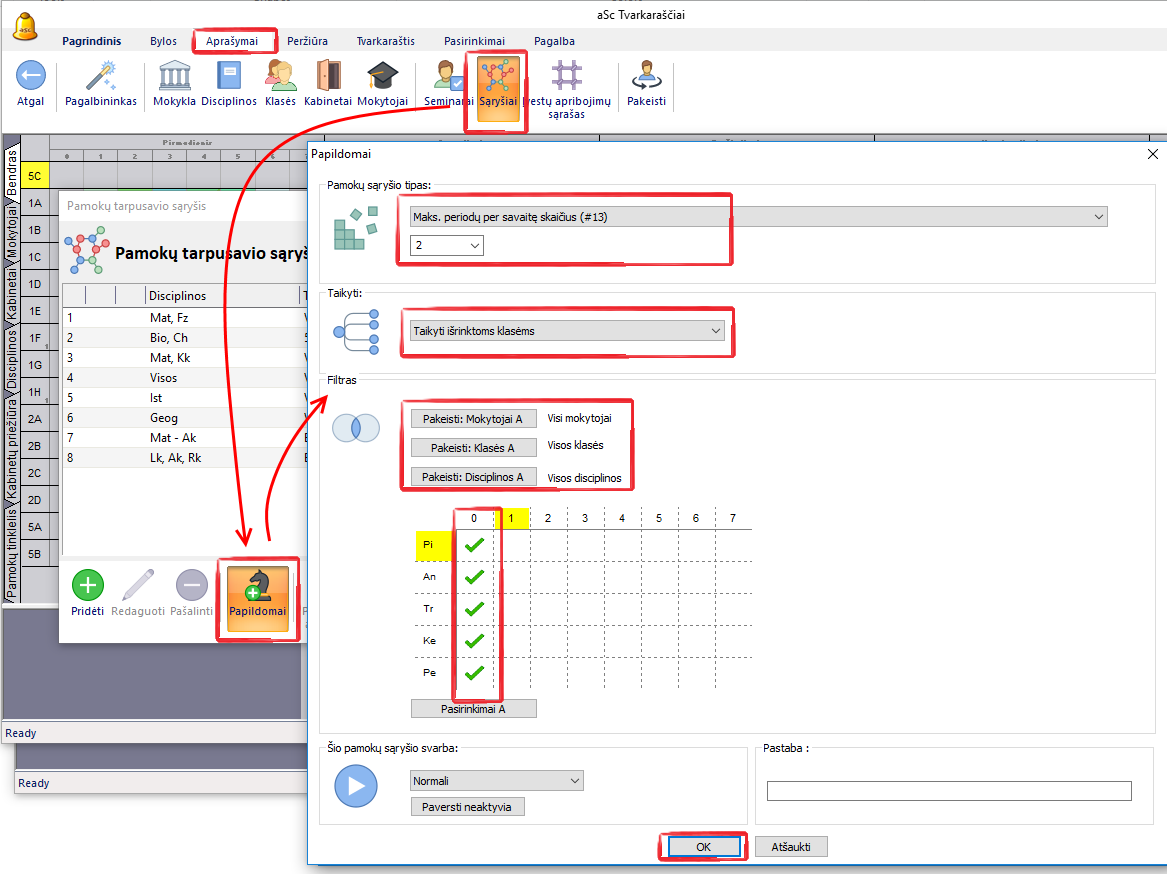 Reikia įvesti papildomą pamokų sąryšį, nurodant, kiek maksimum pamokų per savaitę gali būti pažymėtu metu.