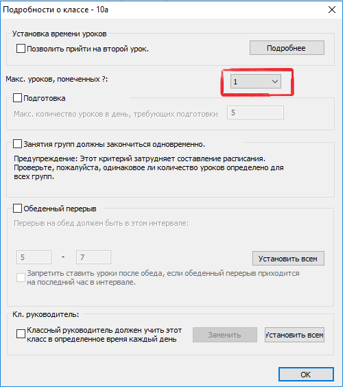 Мы определили, что все классы могут иметь макс. 2 урока на отмеченных позициях в неделю. Таким образом не случится, что один класс будет иметь 3 первых урока в неделю.