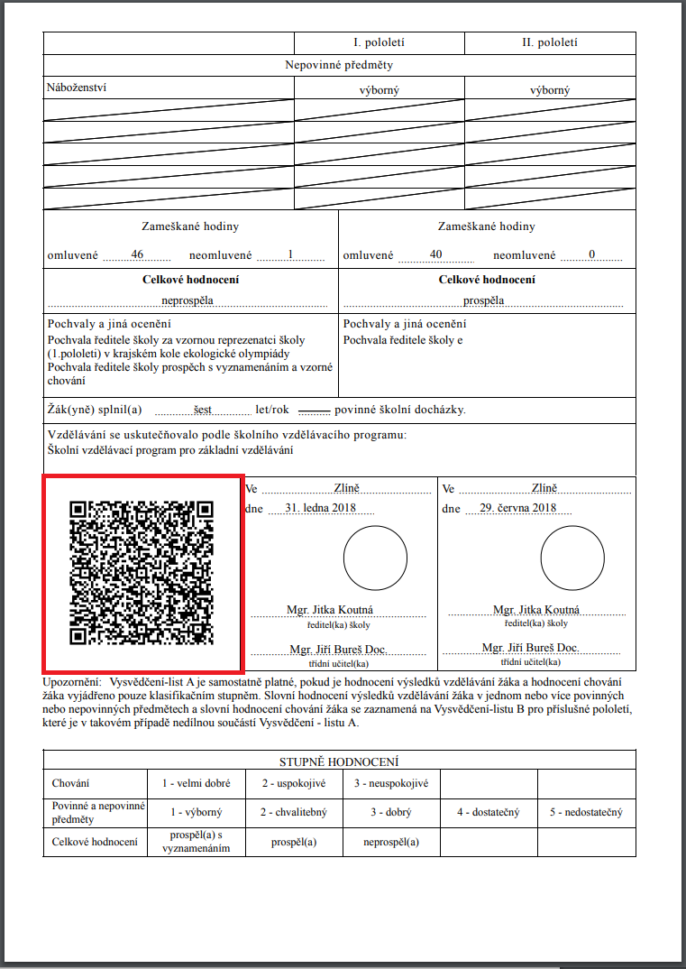 Preto sa QR kód vytlačí len na vysvedčeniach na dokladoch ziskaného vzdelania u žiakov a ostatným žiakom sa vytlačí prázdne pole bez QR kódu.