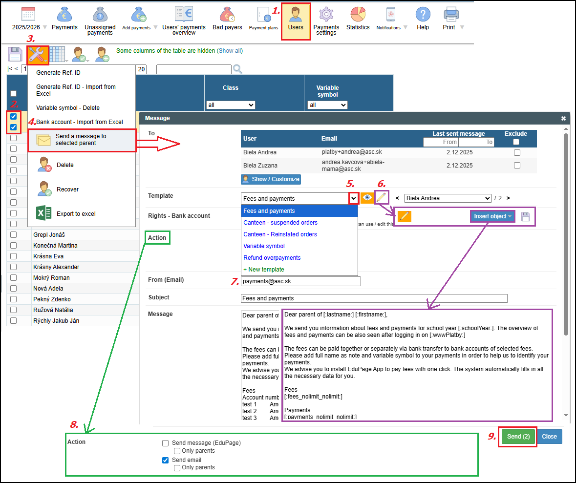 - choose whether message will be sent just as a message to EduPage account or as an email or both (8.)