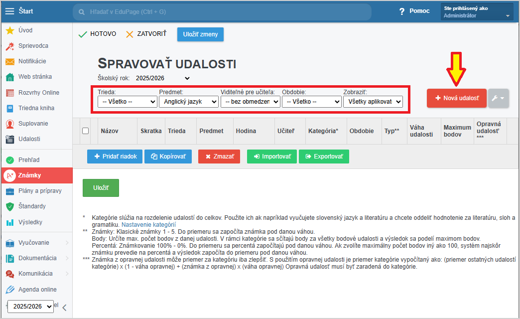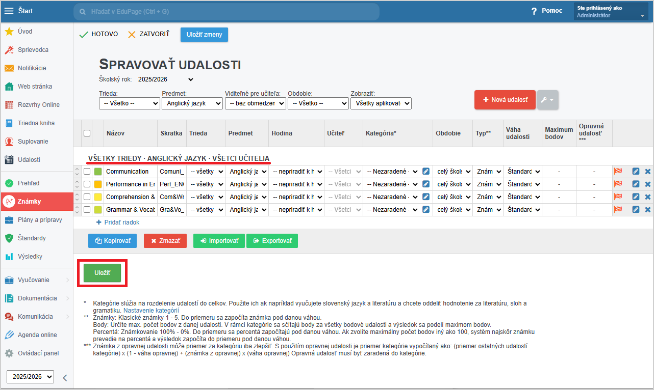 Každý učiteľ si môže známky usporiadať do stĺpcov, t.j. do udalostí, aké chce používať vo svojom predmete: