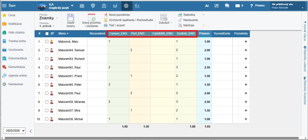 Každý učiteľ, ktorý má hodiny tohto predmetu (v našom príklade Anglický jazyk), potom po prihlásení bude mať v známkach už zadanú udalosť, ktorú ste prednastavili a bude môcť rovno do nej zadávať známky.