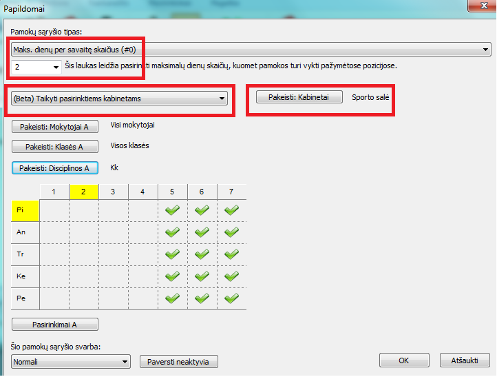 Pavyzdžiui, nurodžius maksimum 2 popietinėms pamokoms, tai reikš, kad 3 popiečius per savaitę salė bus laisva (5-2=3).