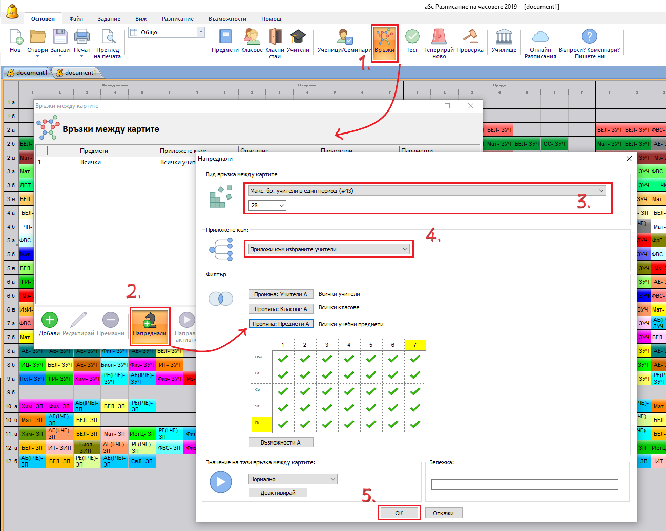- Ако използвате връзки с информационната карта, които започват с "Максимален брой карти" или "Mаксимален брой учебни часове", калкулирането може да не е вярно, когато разделите часовете и часовете с повече учители, свързани на една карта.