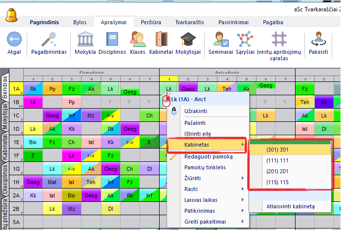 1. Kabinetus galima priskirti rankiniu būdu, paspaudus pamokos kortelę dešiniu pelės mygtuku: