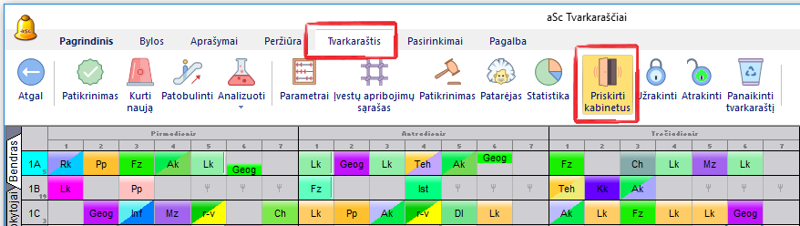Įdedant pamokų korteles į tvarkaraštį rankiniu būdu, programa taip pat automatiškai parinks vieną iš kabinetų.