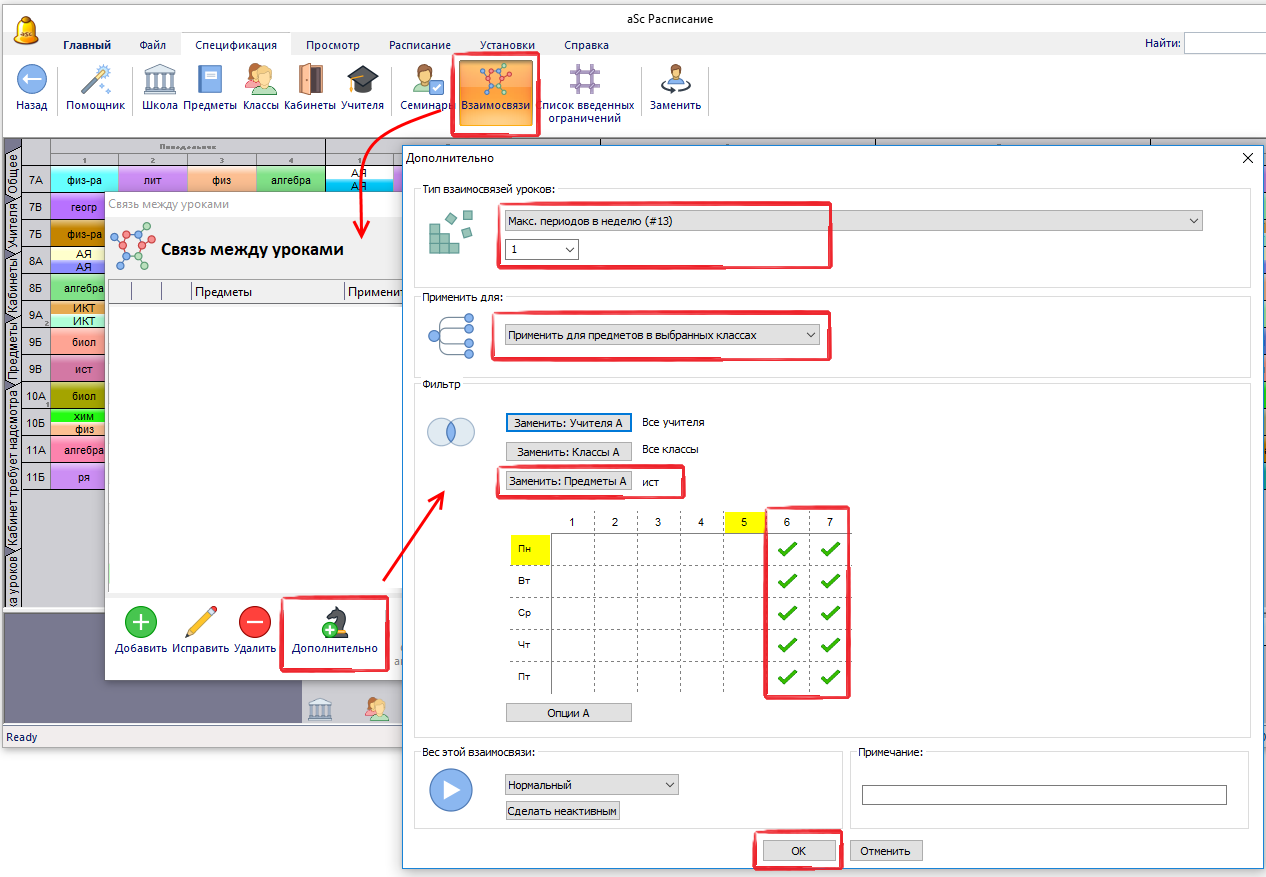 "Макс периодов в неделю (#13)" и указать 6-й и 7-й периоды в таблице: