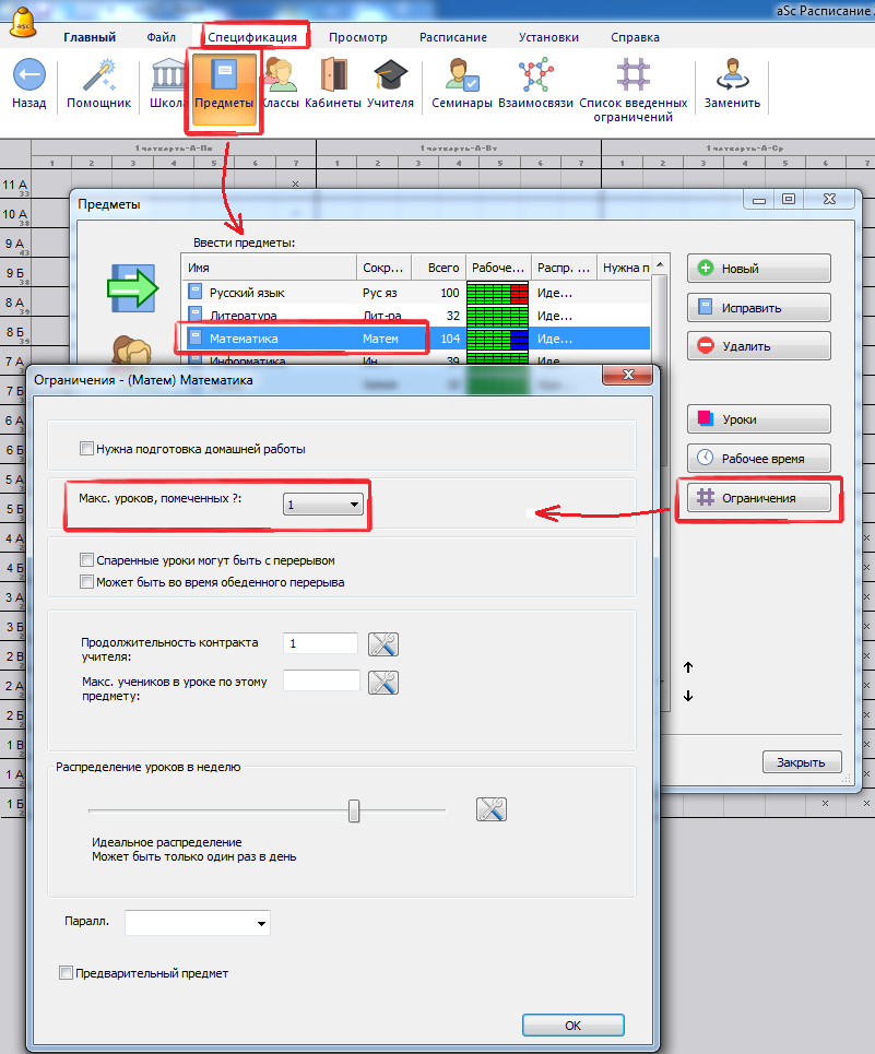 Затем можете задать число уроков данного предмета в позициях, помеченных вопросительным знаком: